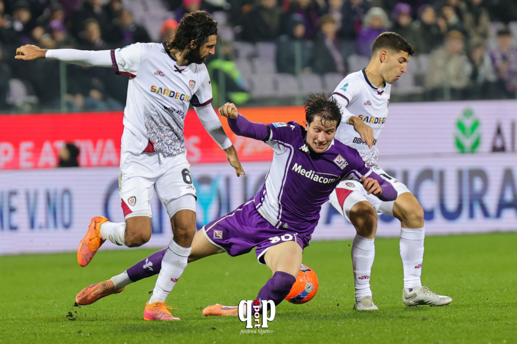 Kean non va neppure in panchina. Primo tempo con la Fiorentina che parte con il giusto approccio. Cagliari chiuso e pronto a ripartire. Al 1’ Gud al tiro sul secondo palo fuori di poco. Al 9’ mischia in area del Cagliari, sugli sviluppi di un corner. Due minuti e tiro alto di Mandragora. Gara bloccata ed al 30’ ospiti in vantaggio con Palestra che la mette dentro e Kilicsoy, perso da Comuzzo, la mette dentro di testa, con deviazione dello stesso Comuzzo. Reazione viola con bella azione di Gud che al 33’ salta due uomini e spara di destro. Para Caprile. Al 38’ Gud per Piccoli che, cadendo, lascia partire un tiro che esce di poco a lato. Fiorentina, comunque, in grande difficoltà di fronte al muro ospite. Al 43’ cross di Palestra, pericoloso, ma catturato da De Gea.